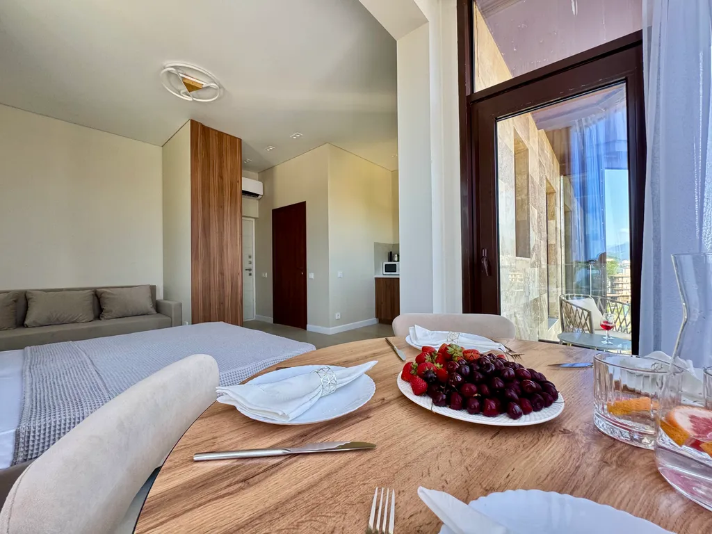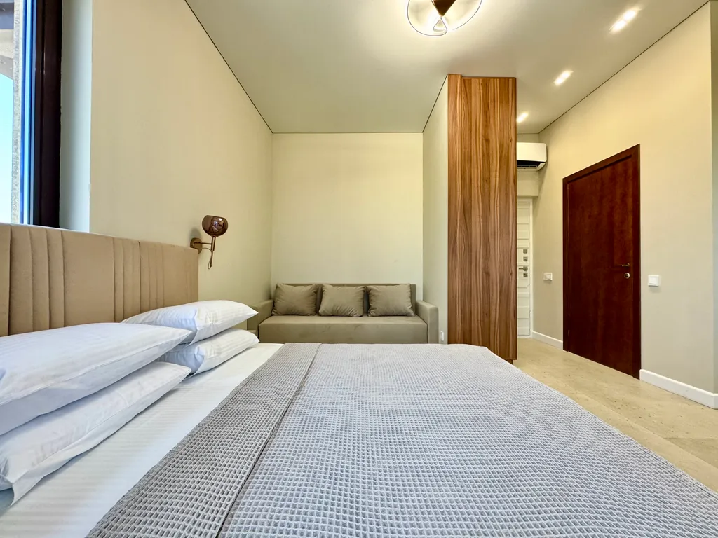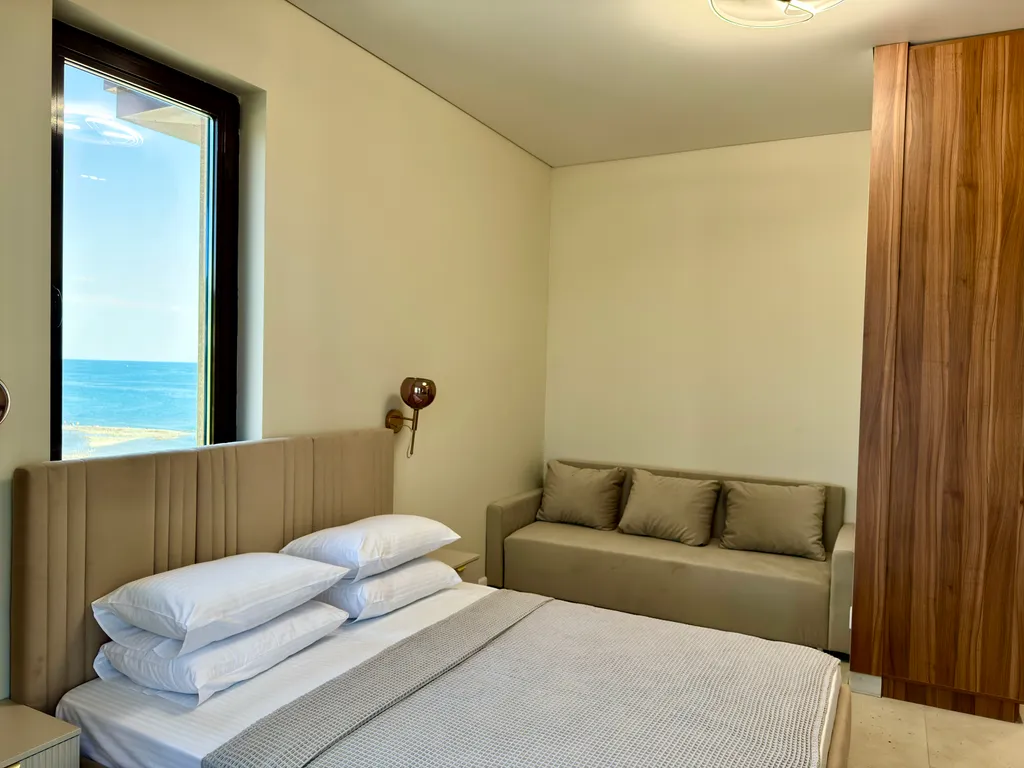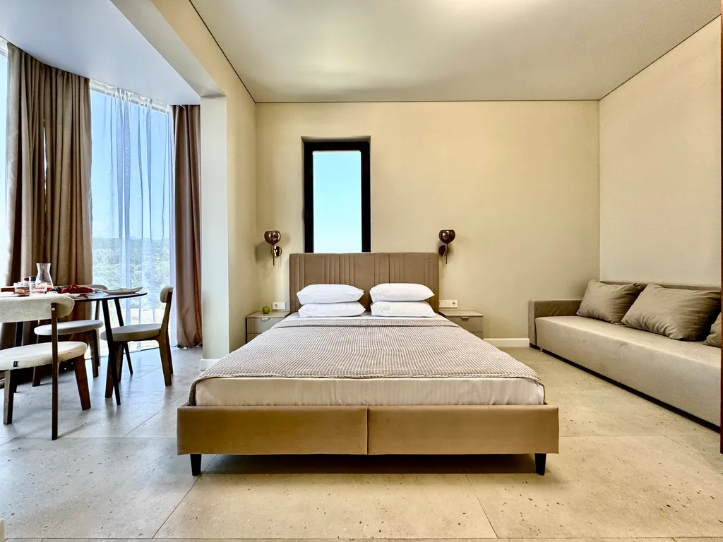 Просторная студия с зоной отдыха и балконом, где можно наслаждаться свежим морским воздухом.