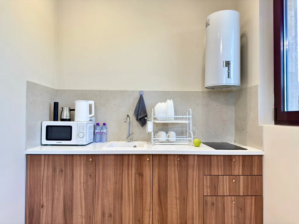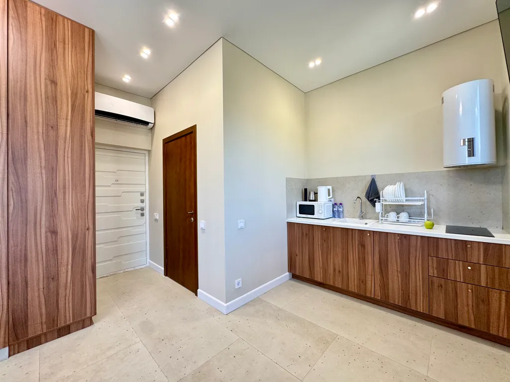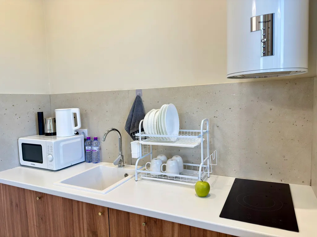 Современная кухня с варочной панелью, встроенным холодильником, посудой, микроволновкой, электрочайником и даже электроштопором для удобства.