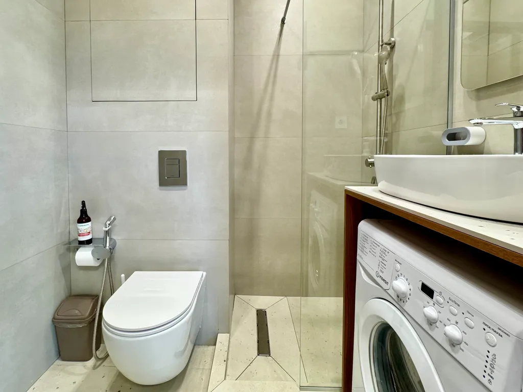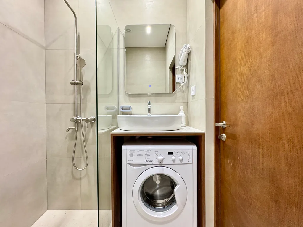 Уют и комфорт: теплые полы, мощный кондиционер, стиральная машина с капсулами, утюг, фен и даже махровые халаты.