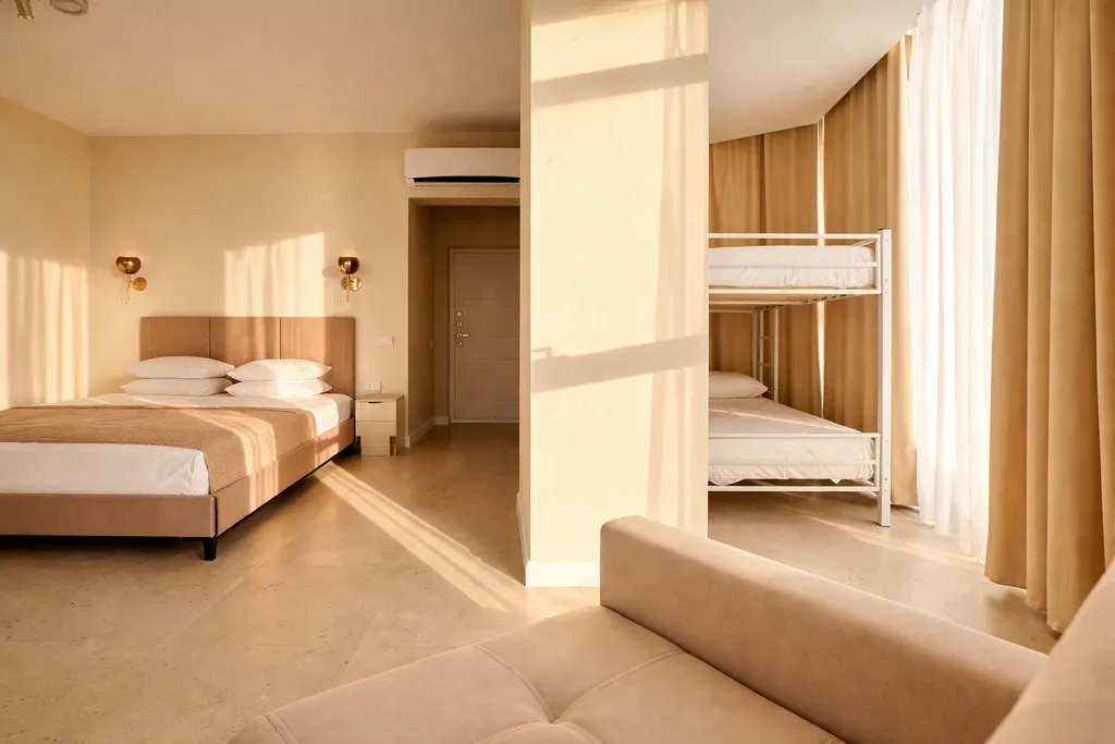 Вместимость апартамента до 6 гостей: комфортная кровать king-sizе (180×200), 2 кресла-кровати (70*190), двухъярусная кровать