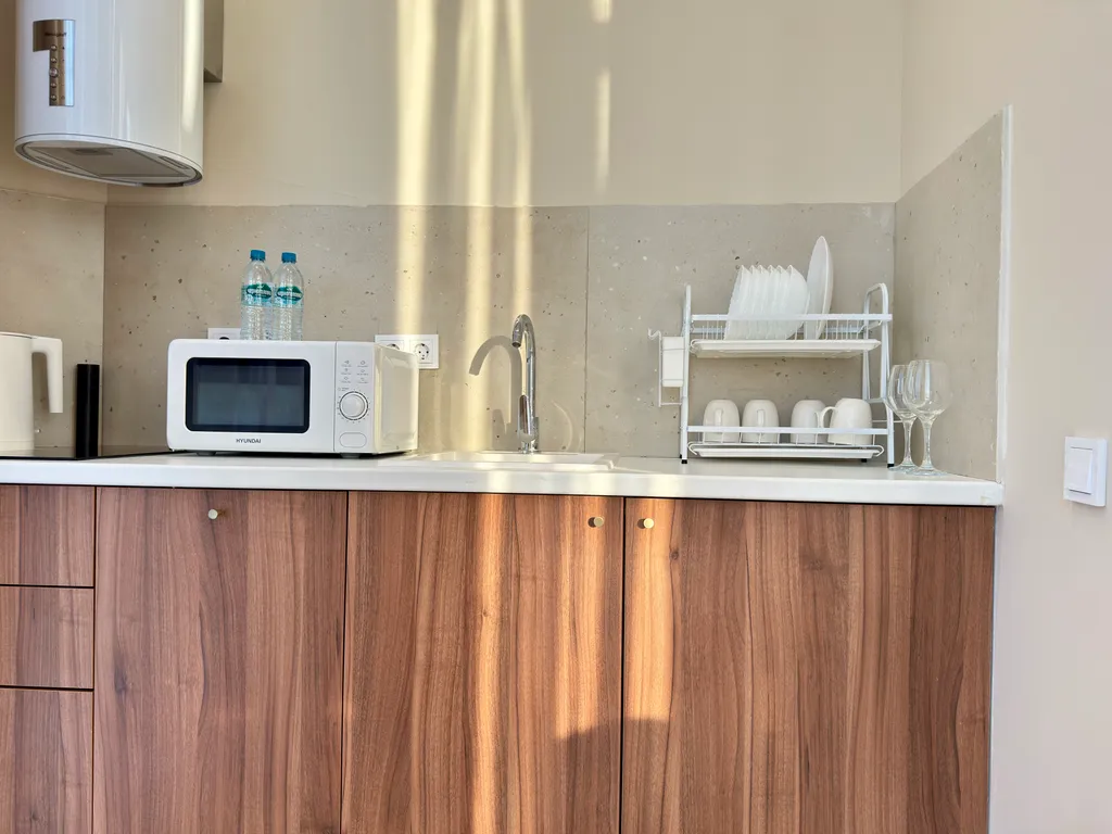 Современная кухня с варочной панелью, встроенным холодильником, посудой, микроволновкой, электрочайником и даже электроштопором для удобства.