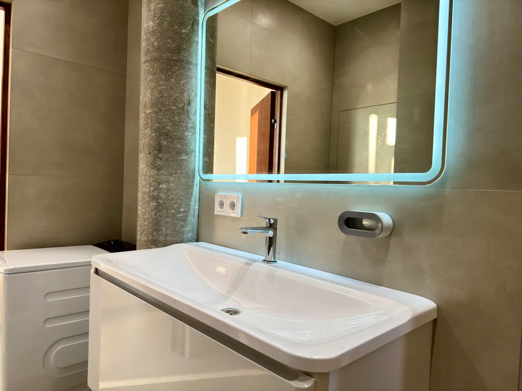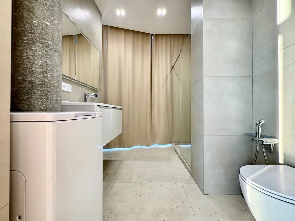 Уют и комфорт: теплые полы, мощный кондиционер, стиральная машина с капсулами, утюг, фен и даже махровые халаты.