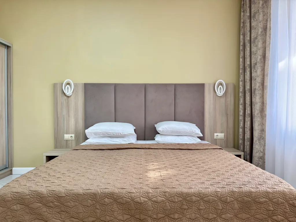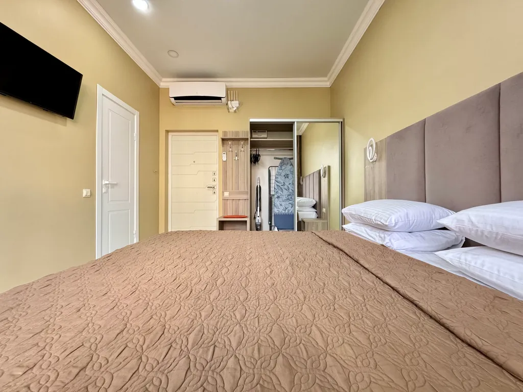 Вместимость апартамента до 2 гостей: комфортная кровать queen-size (160×200).
