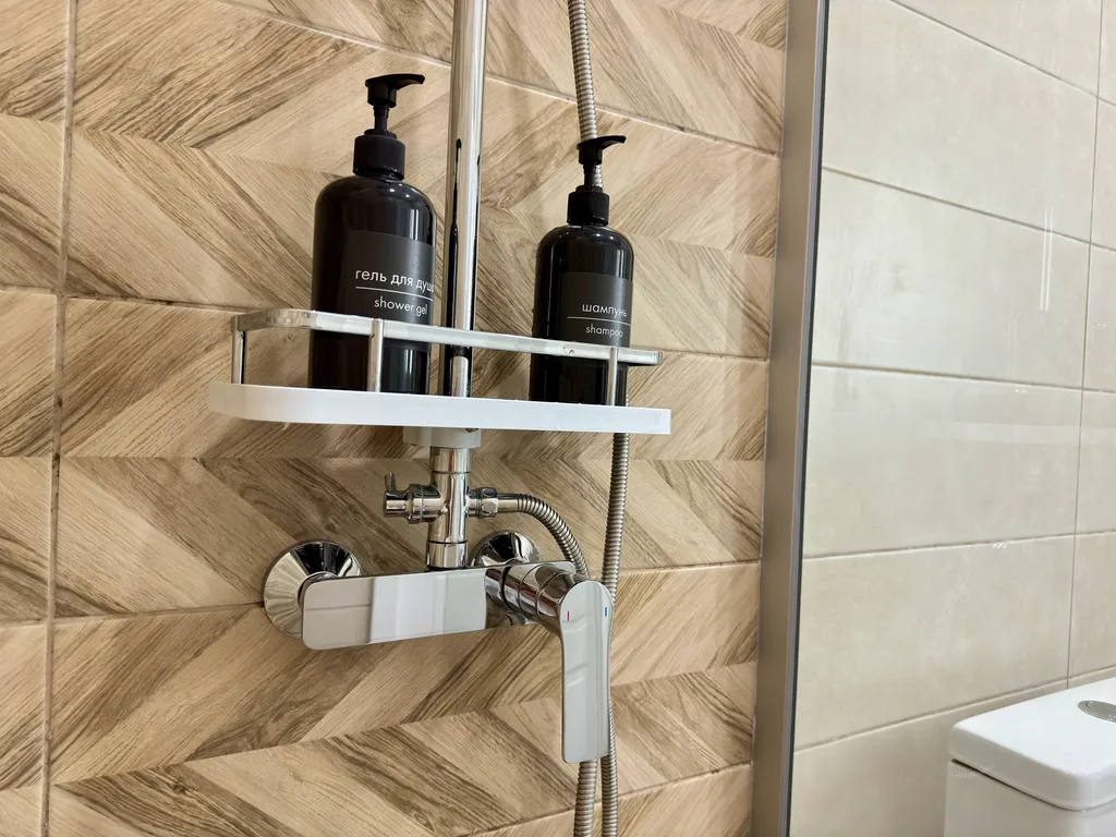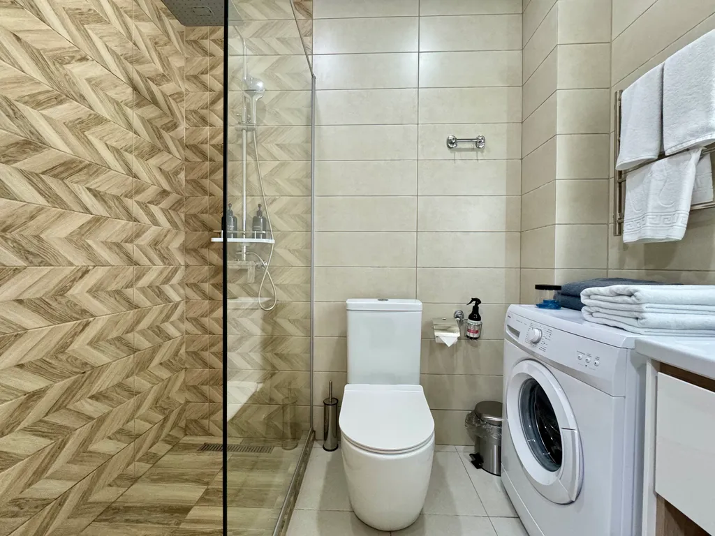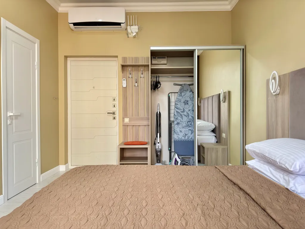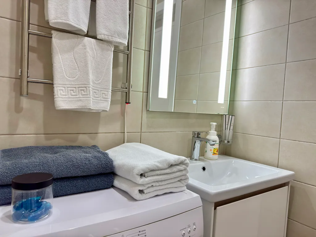 Уют и комфорт: теплые полы, мощный кондиционер, стиральная машина с капсулами, утюг, фен и даже махровые халаты.