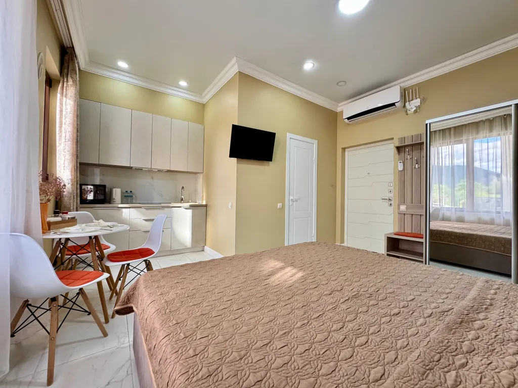 Просторная студия с зоной отдыха, где можно наслаждаться свежим морским воздухом.