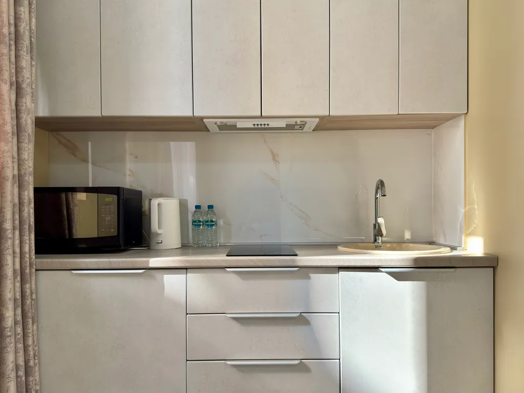 Современная кухня с варочной панелью, встроенным холодильником, посудой, микроволновкой, электрочайником.