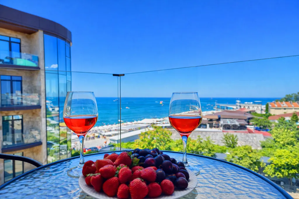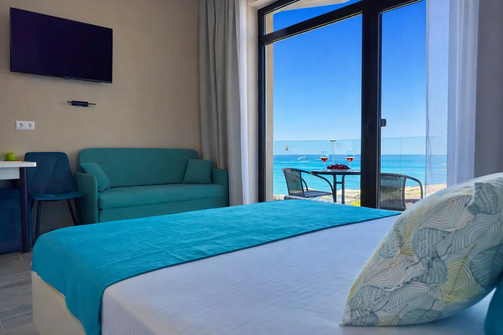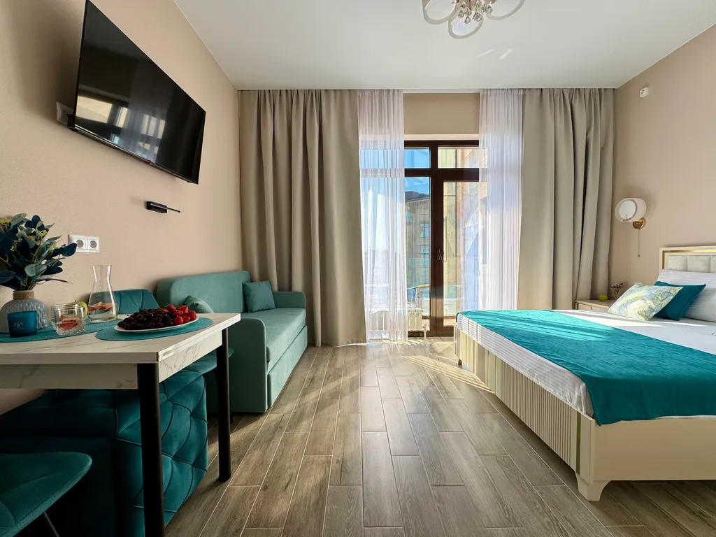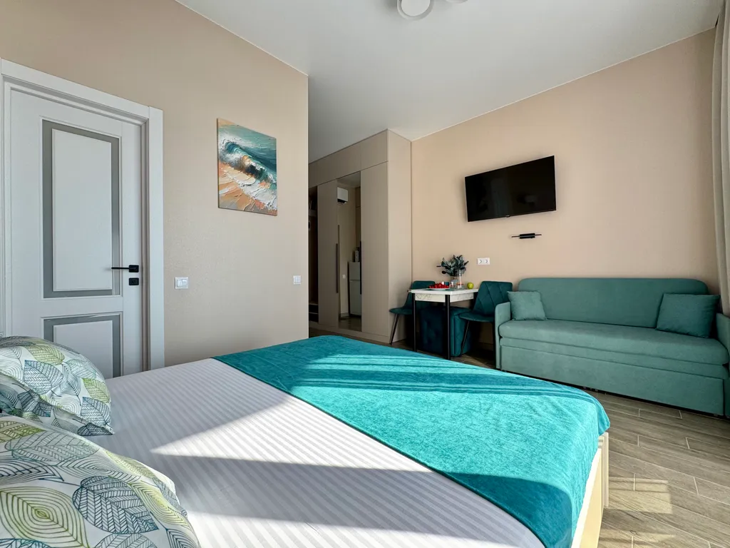 Просторная студия с зоной отдыха и балконом, где можно наслаждаться свежим морским воздухом.