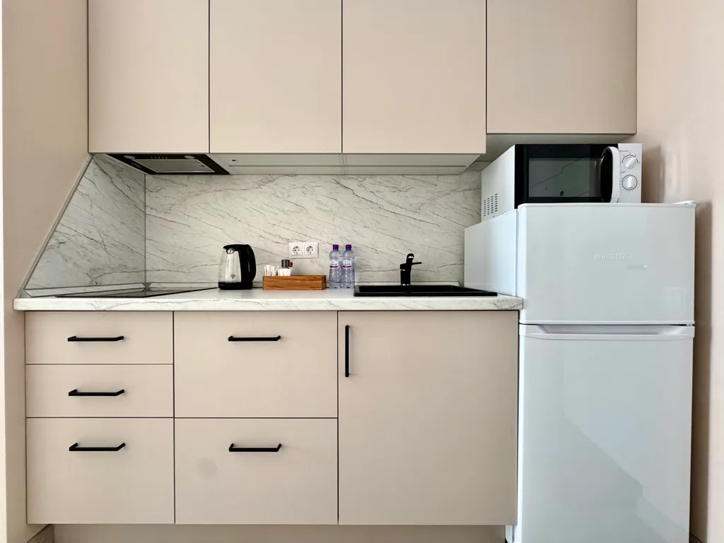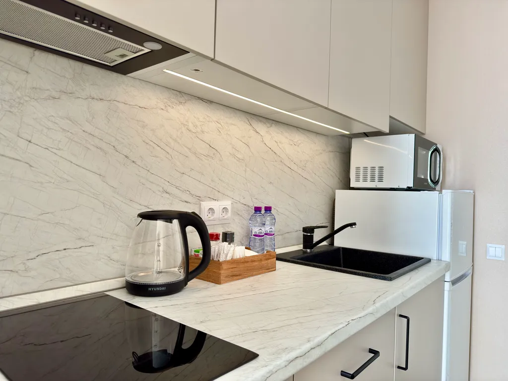 Современная кухня с варочной панелью, встроенным холодильником, посудой, микроволновкой, электрочайником и даже электроштопором для удобства.