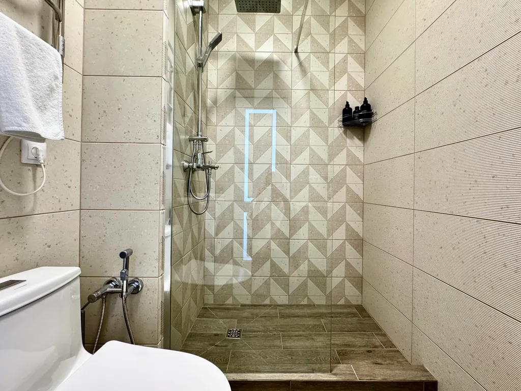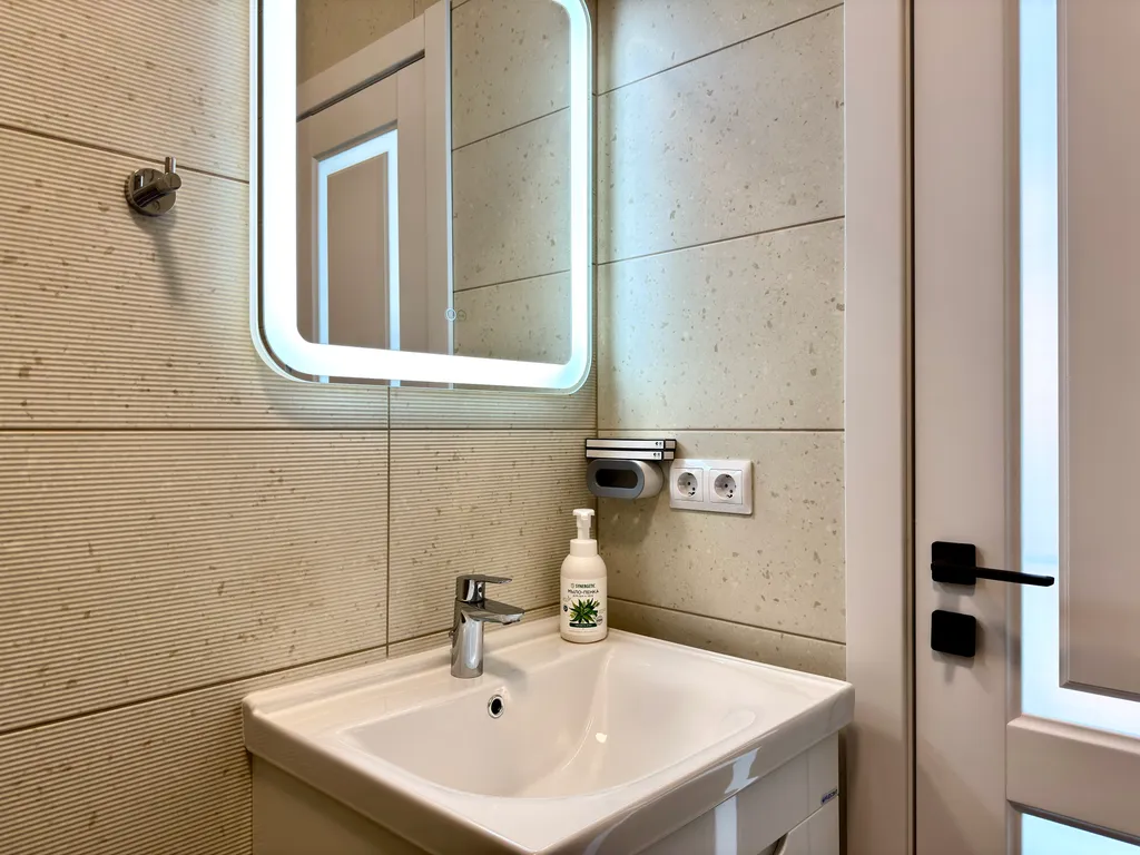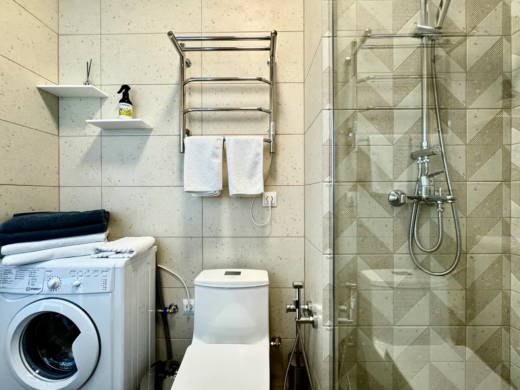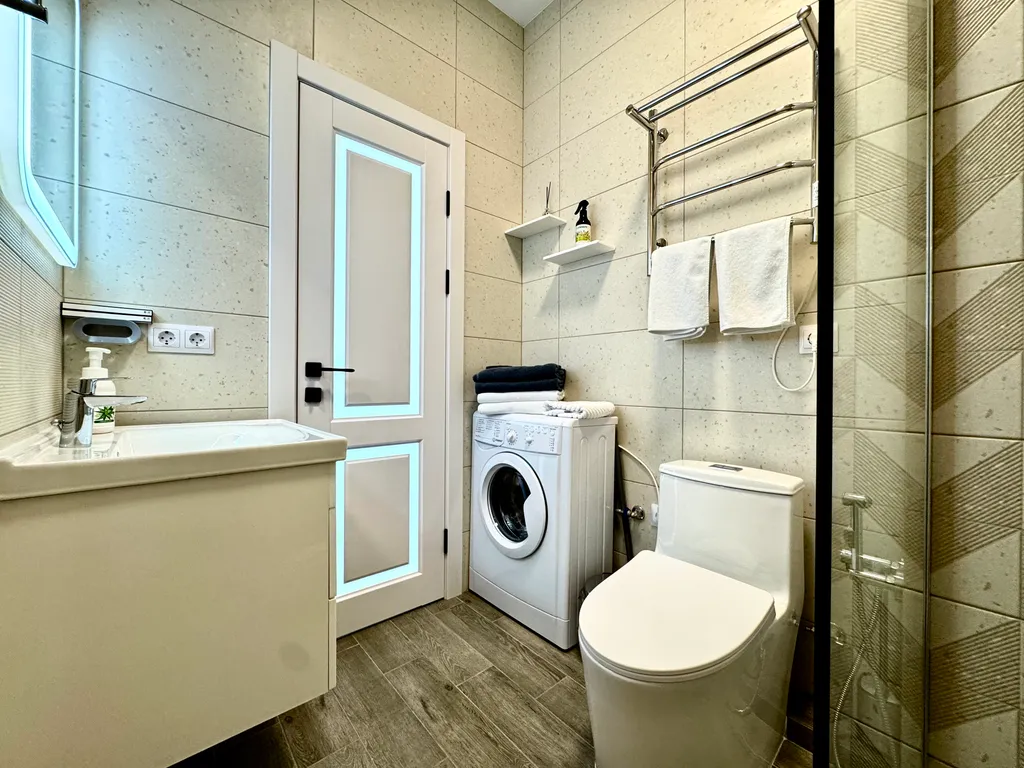 Уют и комфорт: теплые полы, мощный кондиционер, стиральная машина с капсулами, утюг, фен и даже махровые халаты.