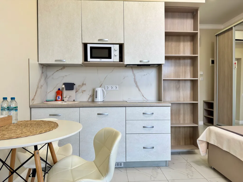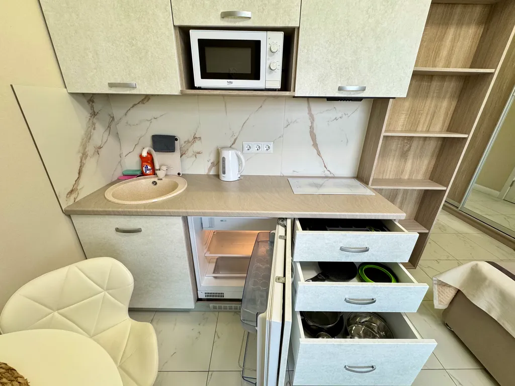 Современная кухня с варочной панелью, встроенным холодильником, посудой, микроволновкой, электрочайником и даже электроштопором для удобства.