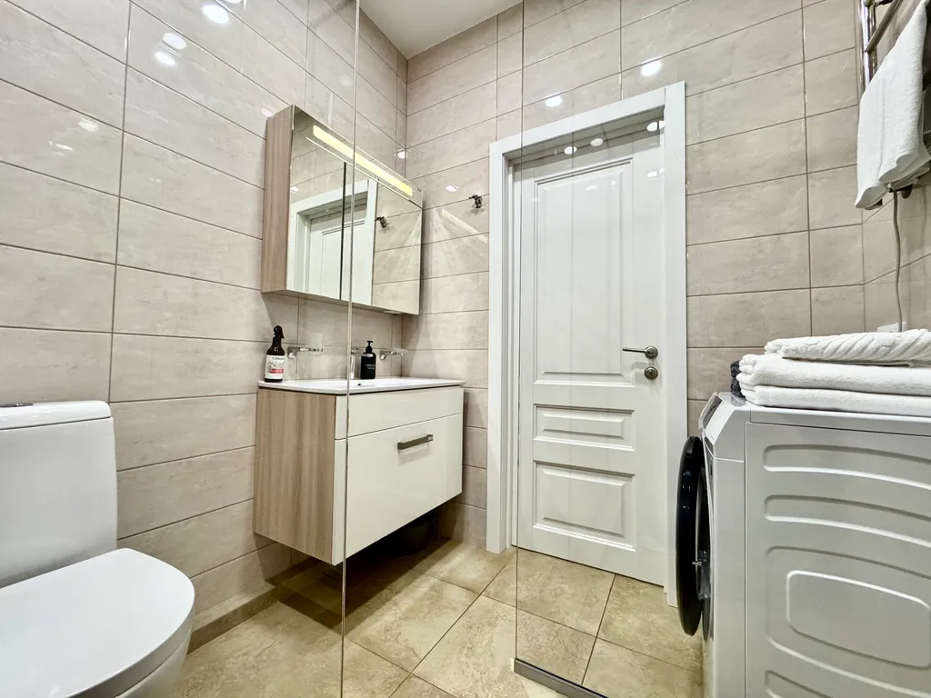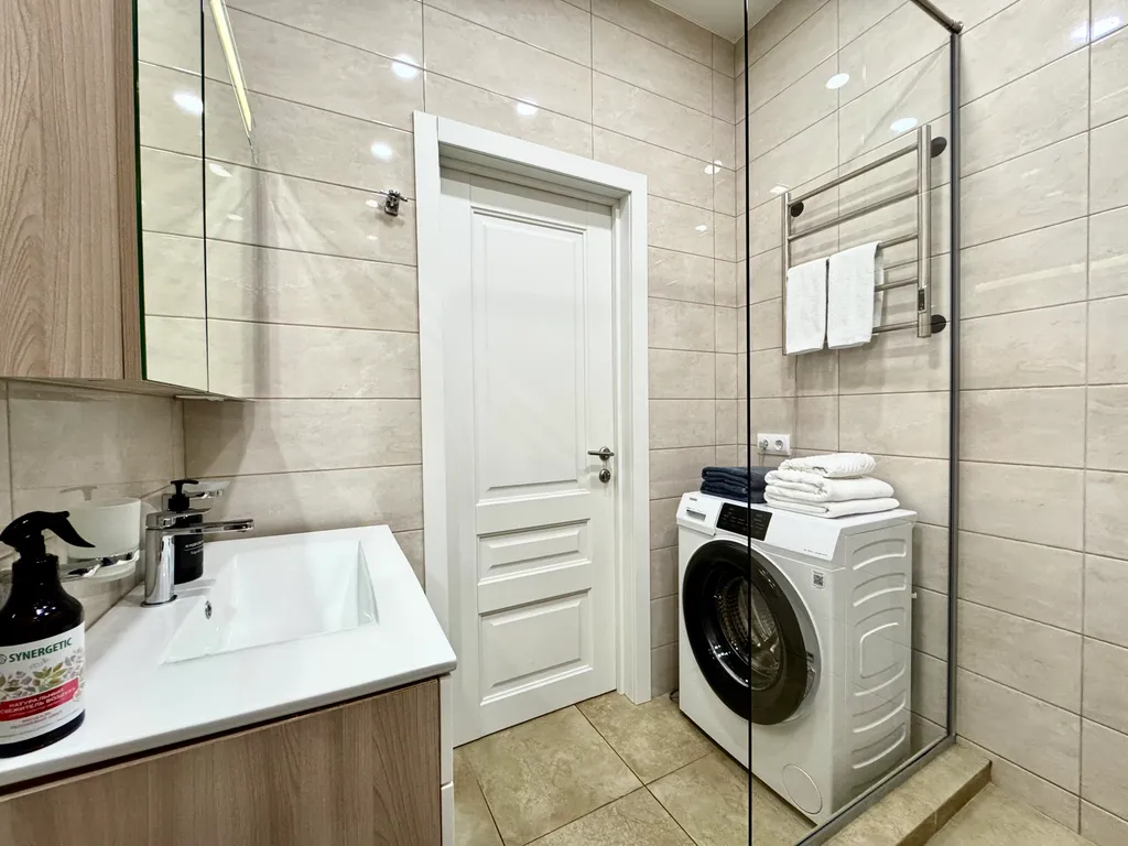Уют и комфорт: теплые полы, мощный кондиционер, стиральная машина с капсулами, утюг, фен и даже махровые халаты.