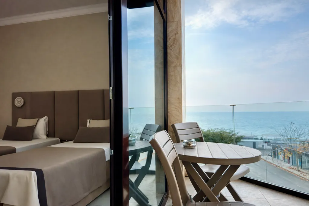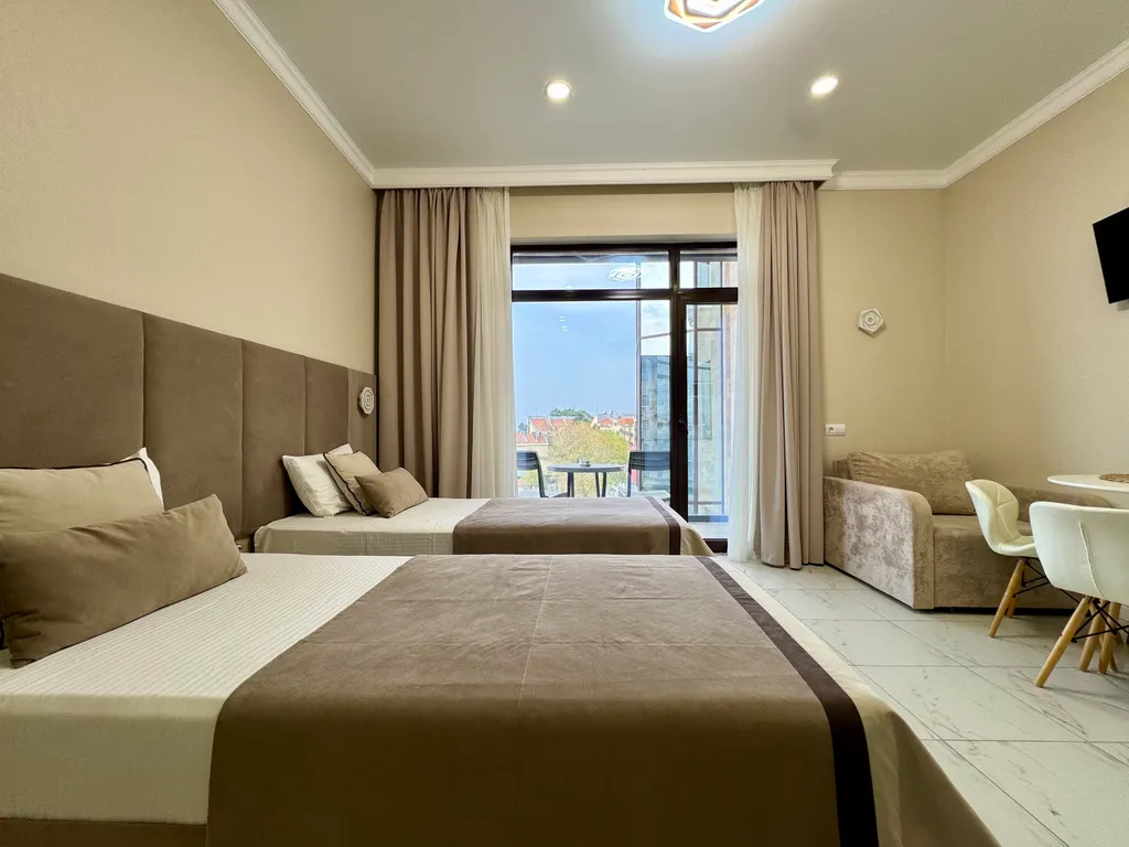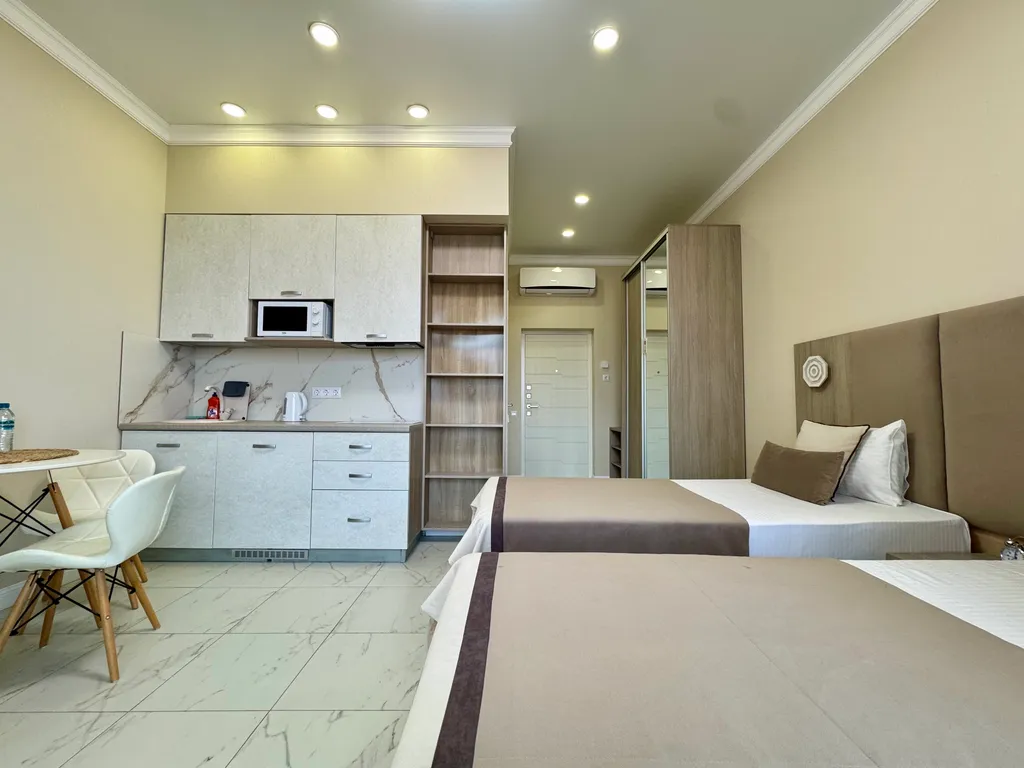 Просторная студия с зоной отдыха и балконом, где можно наслаждаться свежим морским воздухом.