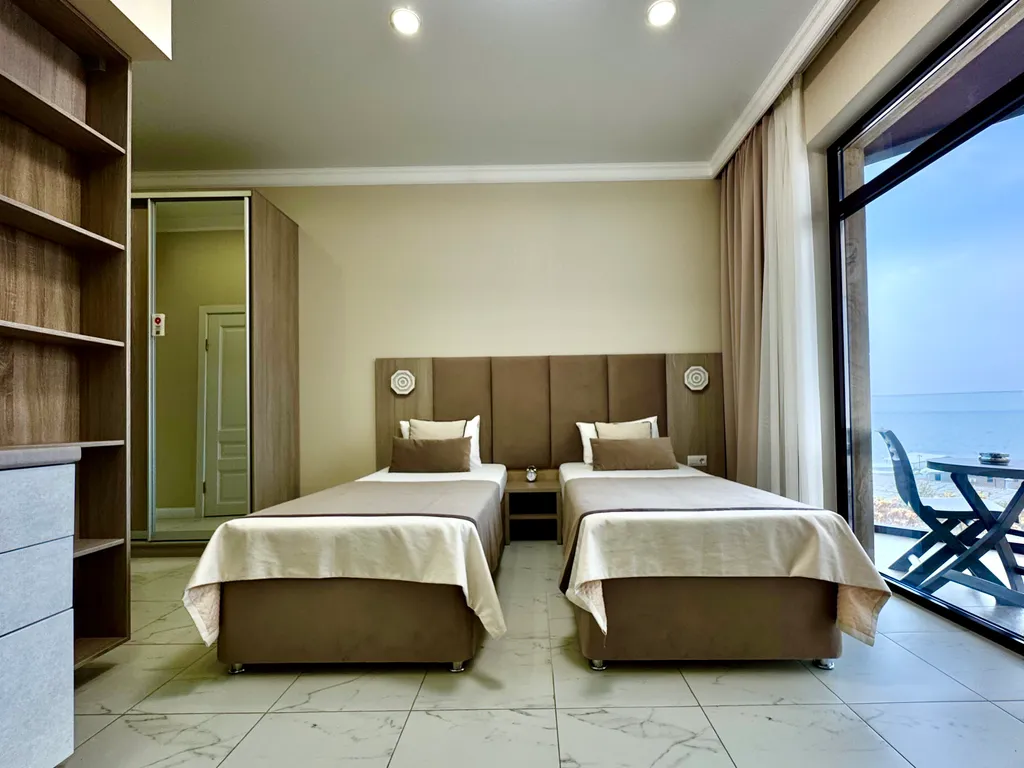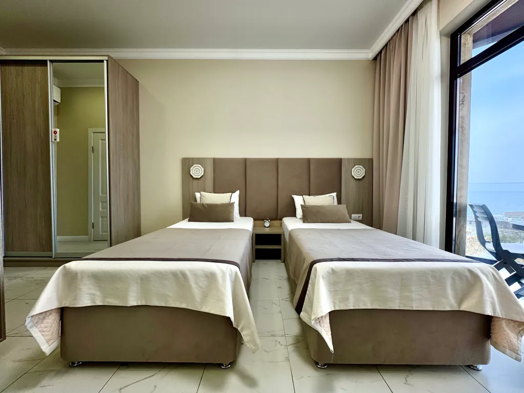 Вместимость апартамента до 3 гостей: две односпальные кровати (90×200) + кресло-кровать для (90×190).