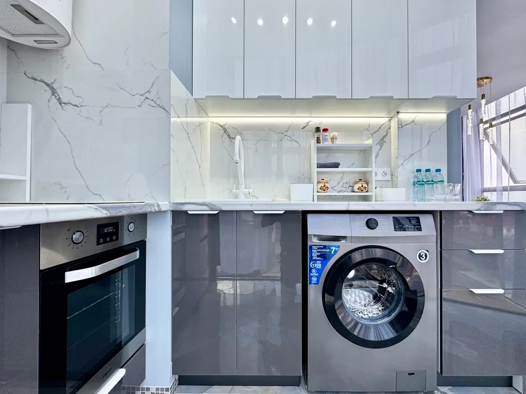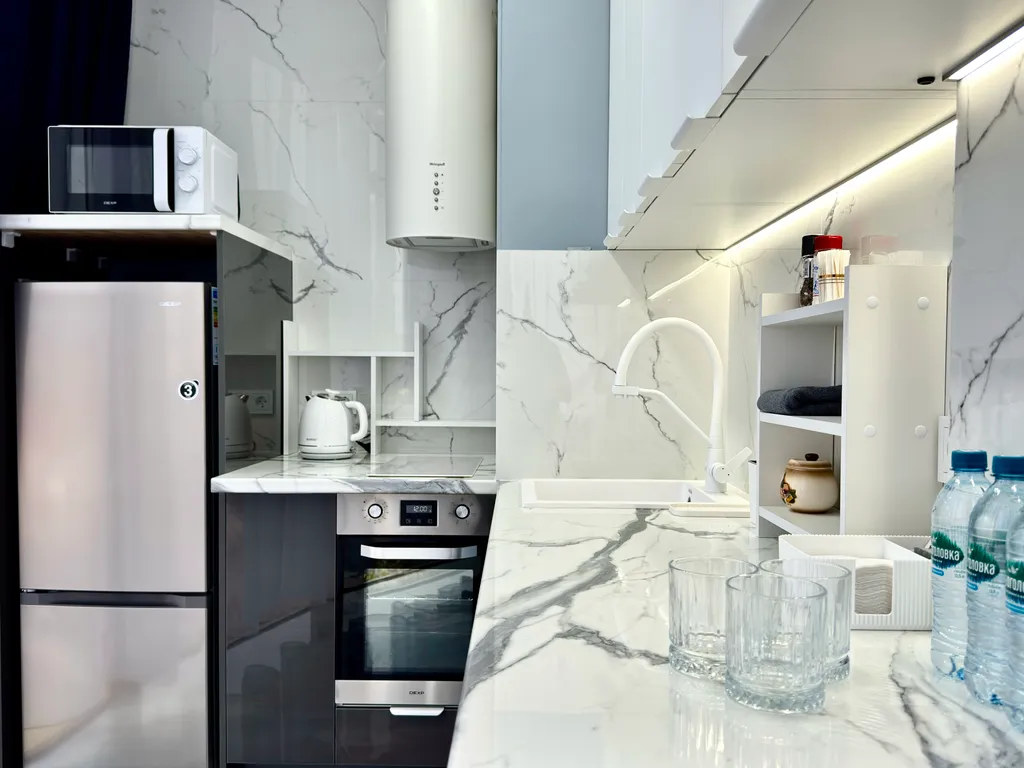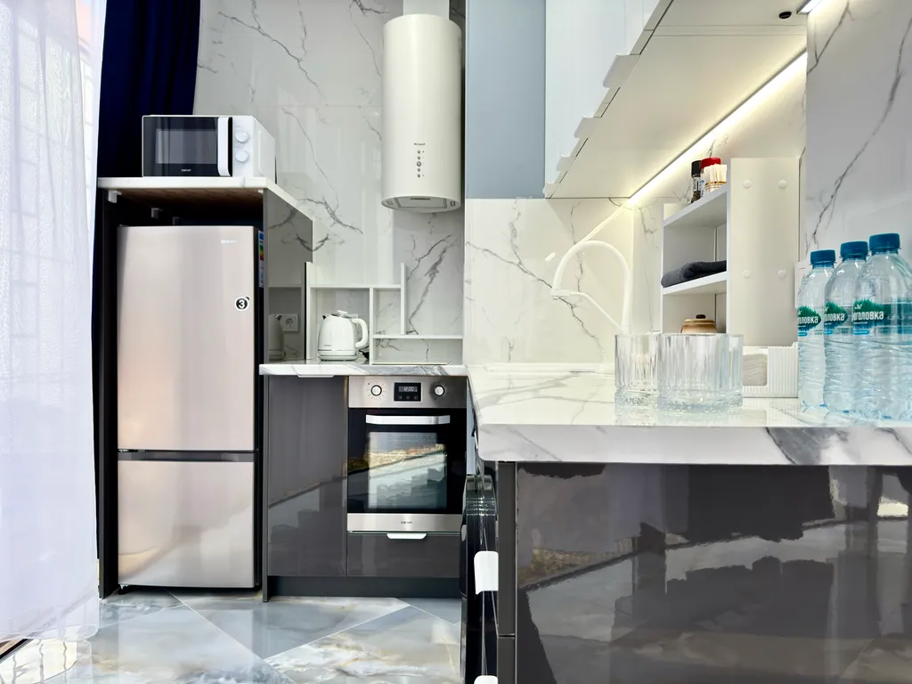 - Современная кухня с варочной панелью, встроенным холодильником, посудой, микроволновкой, электрочайником и даже электроштопором для удобства.