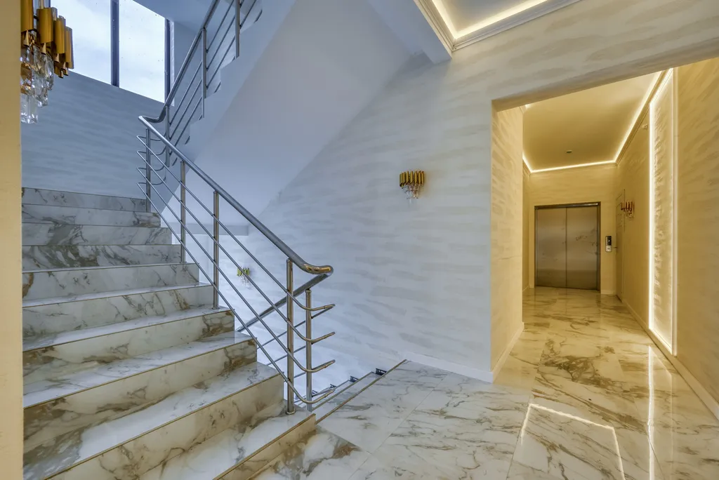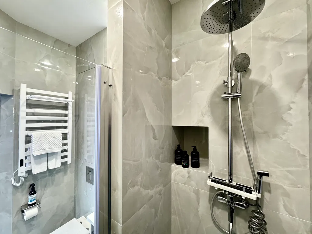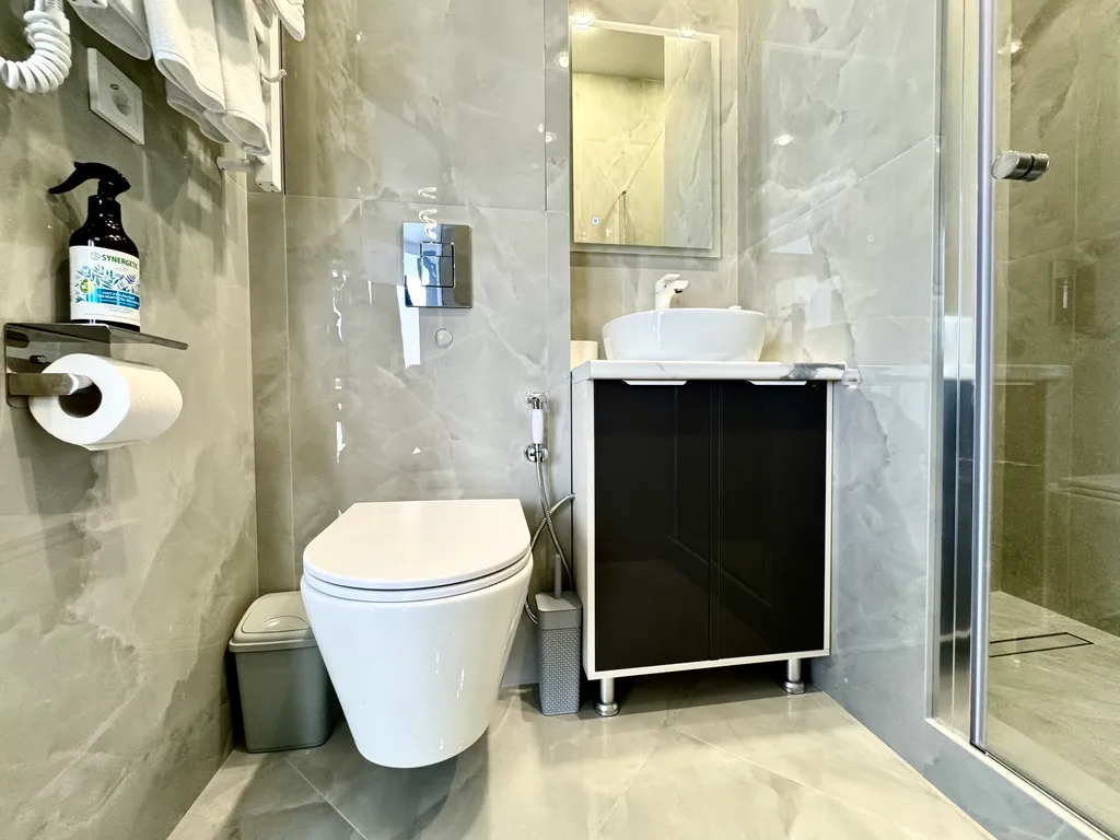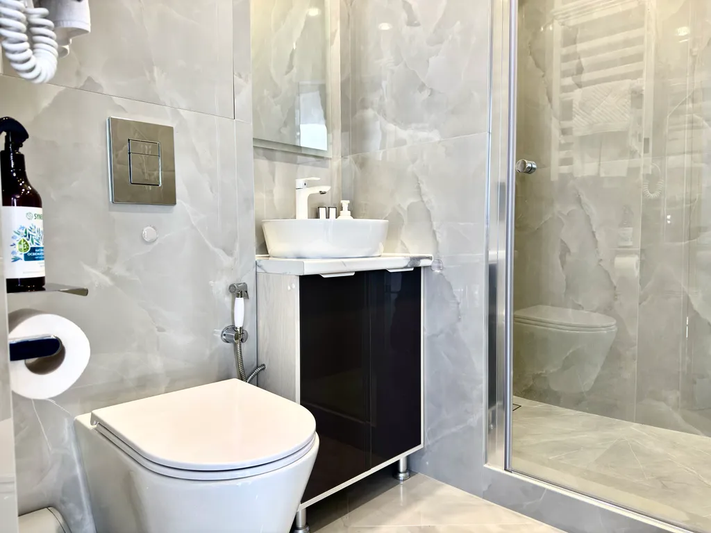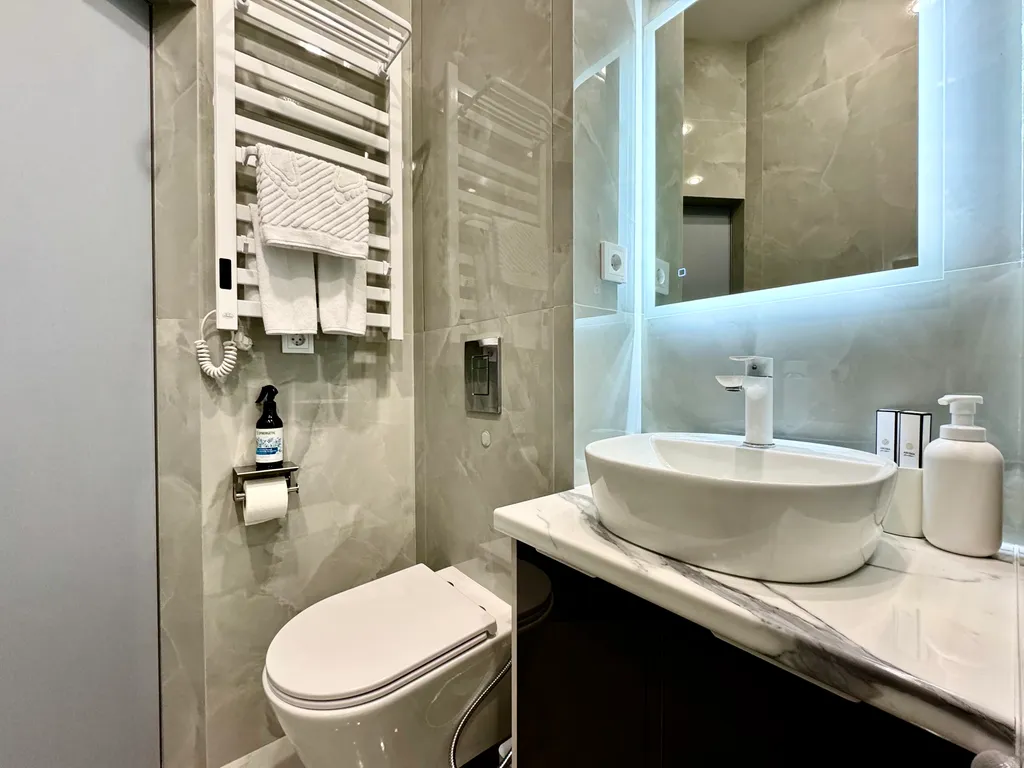 - Уют и комфорт: теплые полы, мощный кондиционер, стиральная машина с капсулами, утюг, фен и даже махровые халаты.