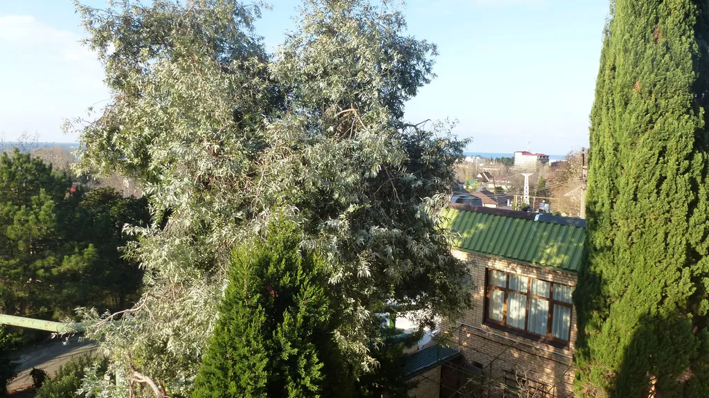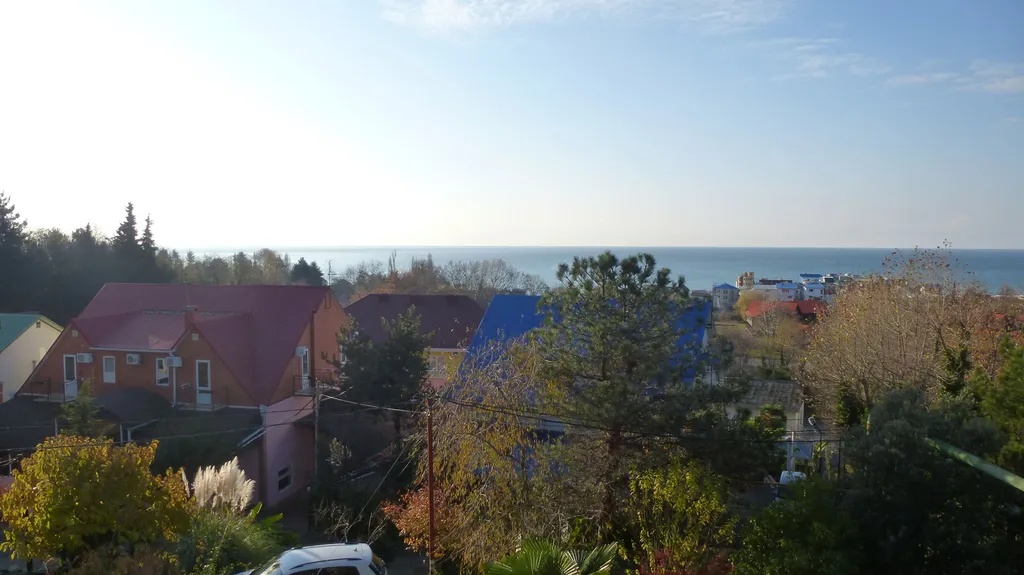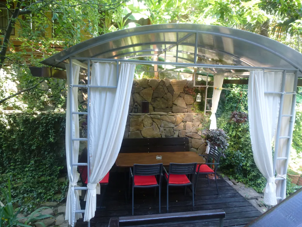 Балкон с видом на море, летнюю беседку. Имеется барбекю.