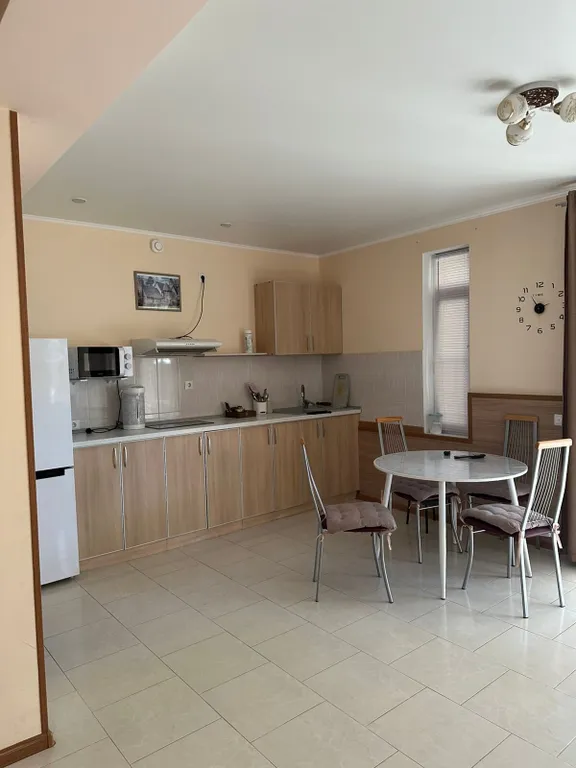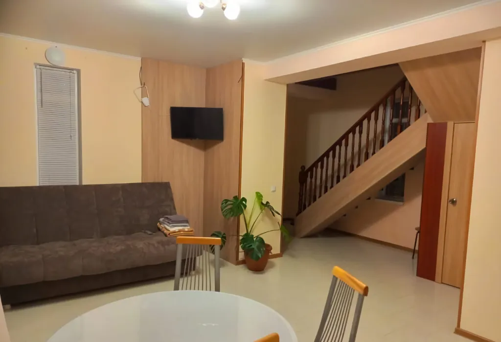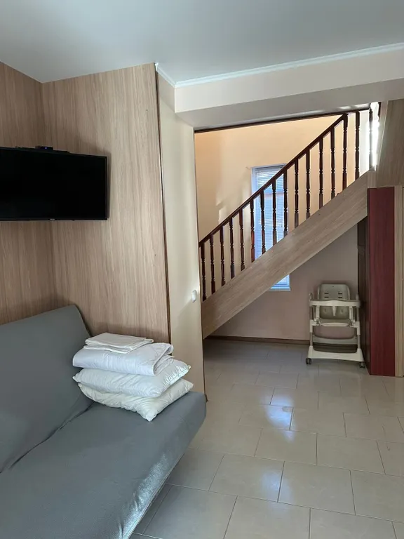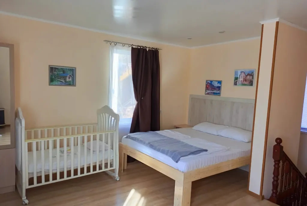 Коттедж двухэтажный: первый этаж кухня-гостиная, санузел. Второй этаж просторная спальней с отделенной детской. В комнате находится кондиционер, телевизор, комод, шкаф. На кухне плита, стиральная машина, холодильник, микроволновая печь, чайник, мультиварка и вся необходимая посуда.