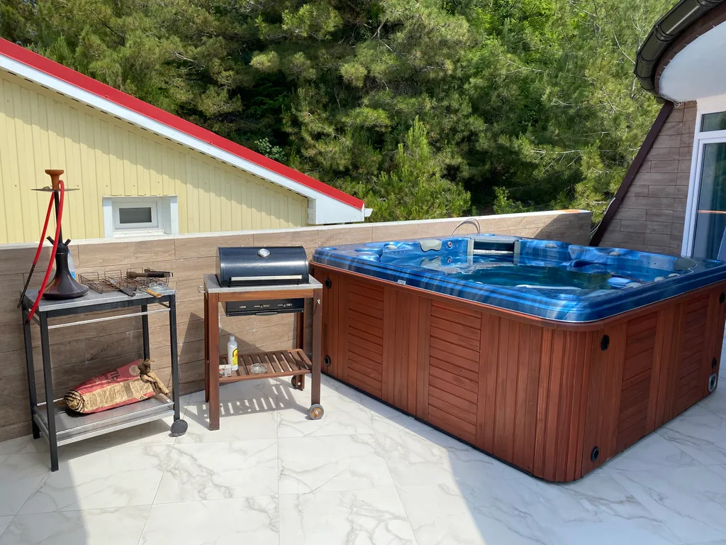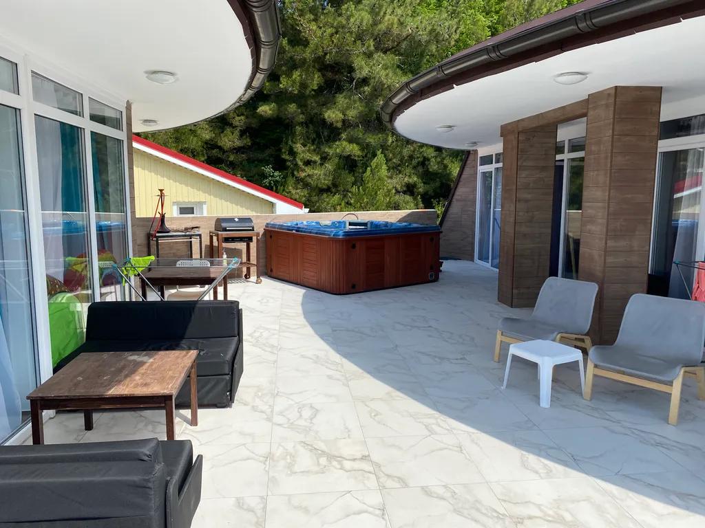 Выход из номера на общую смотровую площадку, предназначенную для гостей проживающих на этом этаже гостевого дома. На площадке предусмотрена зона отдыха с уютными диванчиками, барбекю и прохладный джакузи.