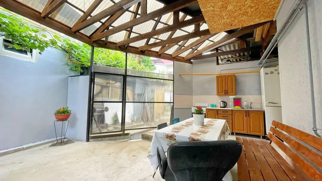 Небольшой семейный дом эконом класса из трёх проходных комнат вмещает от 4х до 6ти человек, сплит система, жк телевизор, двор общий поделён по зонам, летняя кухня общая, парковка, мангал общий до моря 2 минуты, санузел общий, расположен в котельной, район аквапарка морская звезда!!! На территории проживают и другие отдыхающие. Ул лазарева 25а