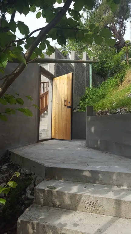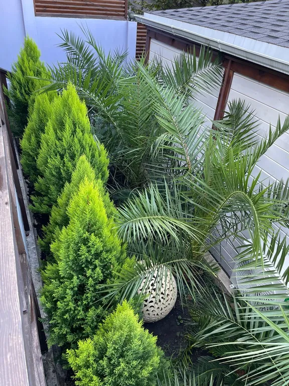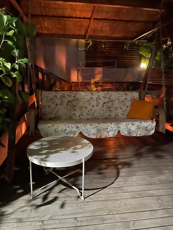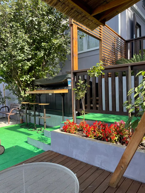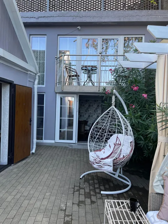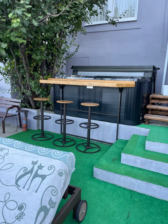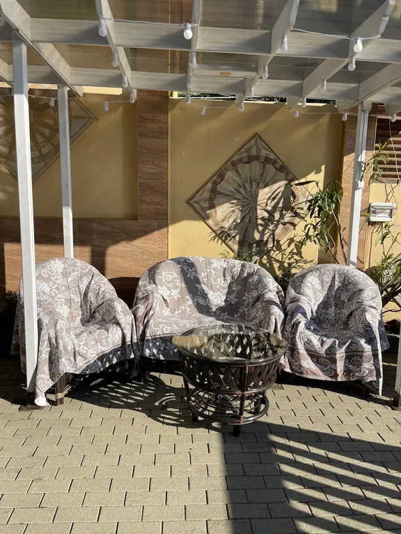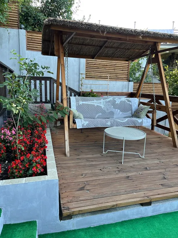 Во дворе расположена зона отдыха под навесом, в которой находится мягкая мебель из натурального ротанга, подвесное кресло- кокон, деревянная трёхместная качель, у спа-бассейна установлена барная стойка со стульями, деревянные шезлонги, большой зонт от солнца, стол со стульями.