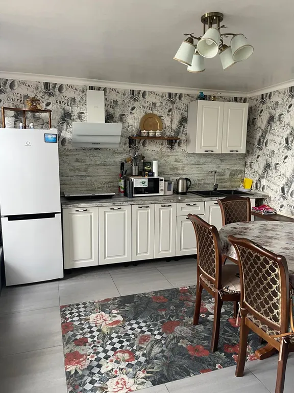 На первом этаже одного из домиков расположена кухня, полностью оборудованная техникой и посудой.,