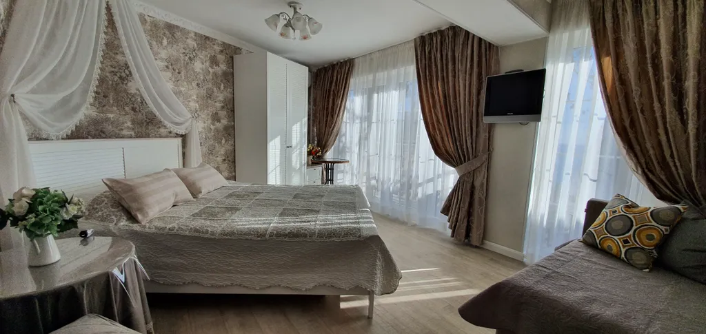 Дом состоит из 3 жилых, раздельных комнат. Мебель вся новая, интерьер в стиле прованс. Из окон домиков и двора открывается шикарный вид на море, в вечернее время можно наблюдать великолепные закаты!