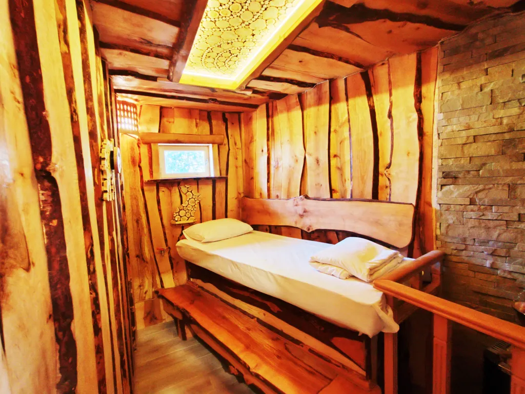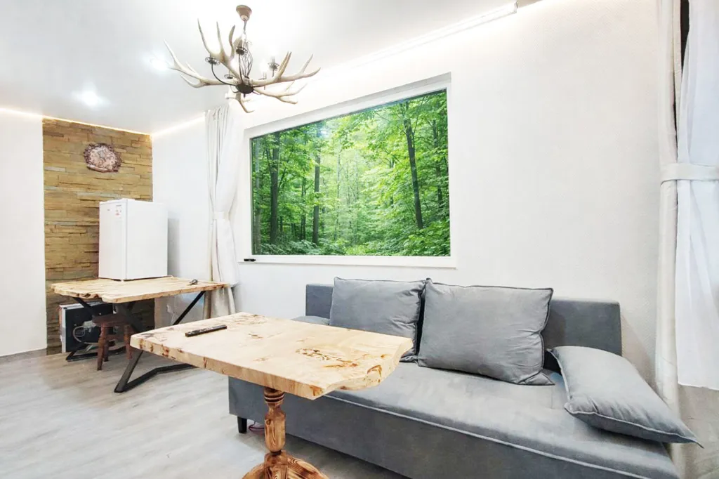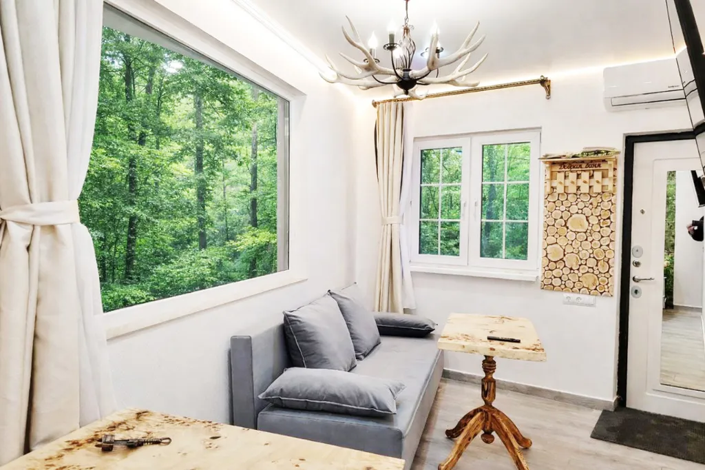 Дом расположен в лесу, на границе национального парка, в 380 метрах от моря и может принять до 3 человек. В доме есть гостиная с двуспальным диваном и панорамными окнами в лес, оборудованная большим телевизором и сплит-системой, + небольшая спальня с односпальной кроватью, есть санузел и отдельная большая душевая. До моря 6 минут спокойным шагом по тропе и далее через сквер, ближайшие магазин и столовая расположены в 20 метрах от дома.